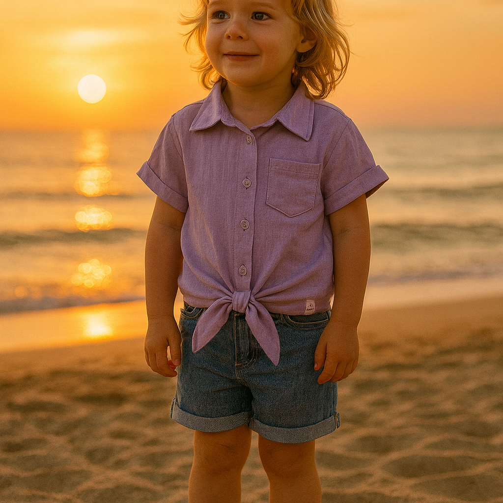 Chemise nouée fille – Coton gaufré – Couleur Lilas 🪻