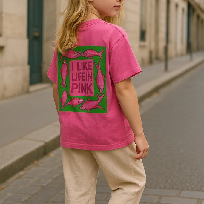 T-shirt enfant oversize – “I LIKE LIFE IN PINK” – Rose fuchsia