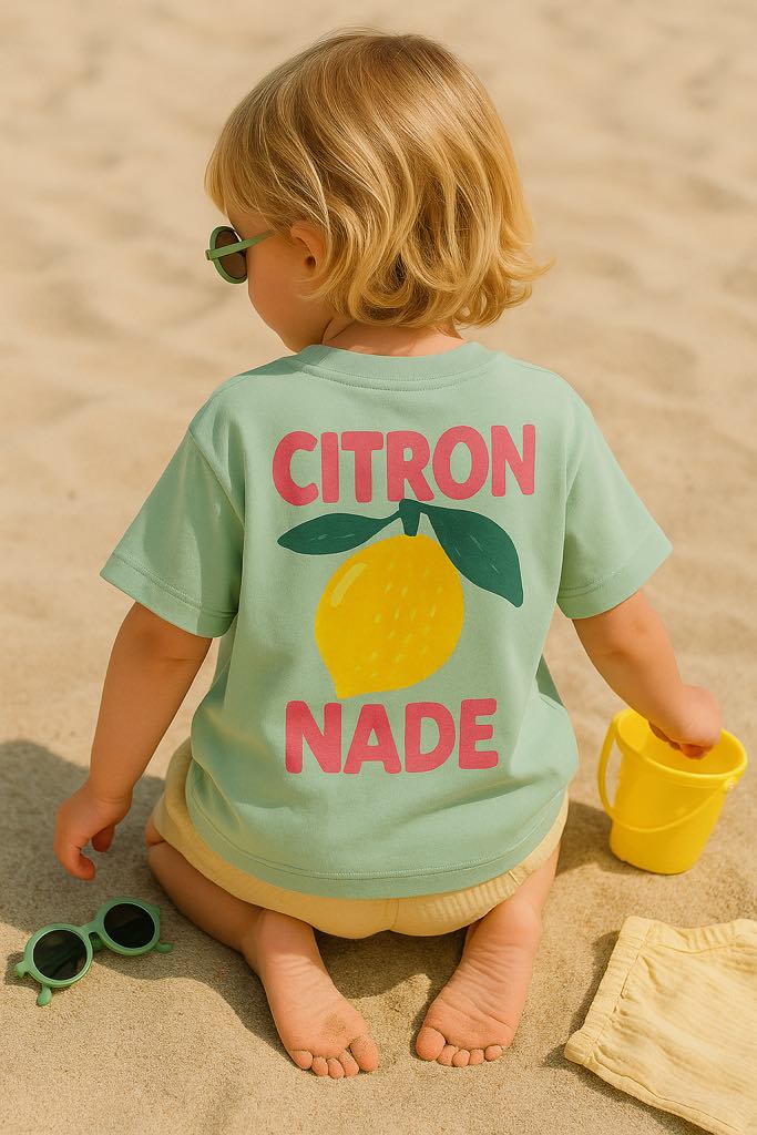 Un vent de fraîcheur souffle sur le dressing des kids ! Ce t-shirt enfant oversize vert menthe affiche un imprimé fun et fruité avec un citron jaune et l’inscription “CITRON NADE” au dos. Face avant uni pour plus de simplicité. Ultra confortable avec sa coupe ample et son coton doux, il est parfait pour l’été ou pour apporter une touche vitaminée aux looks du quotidien.